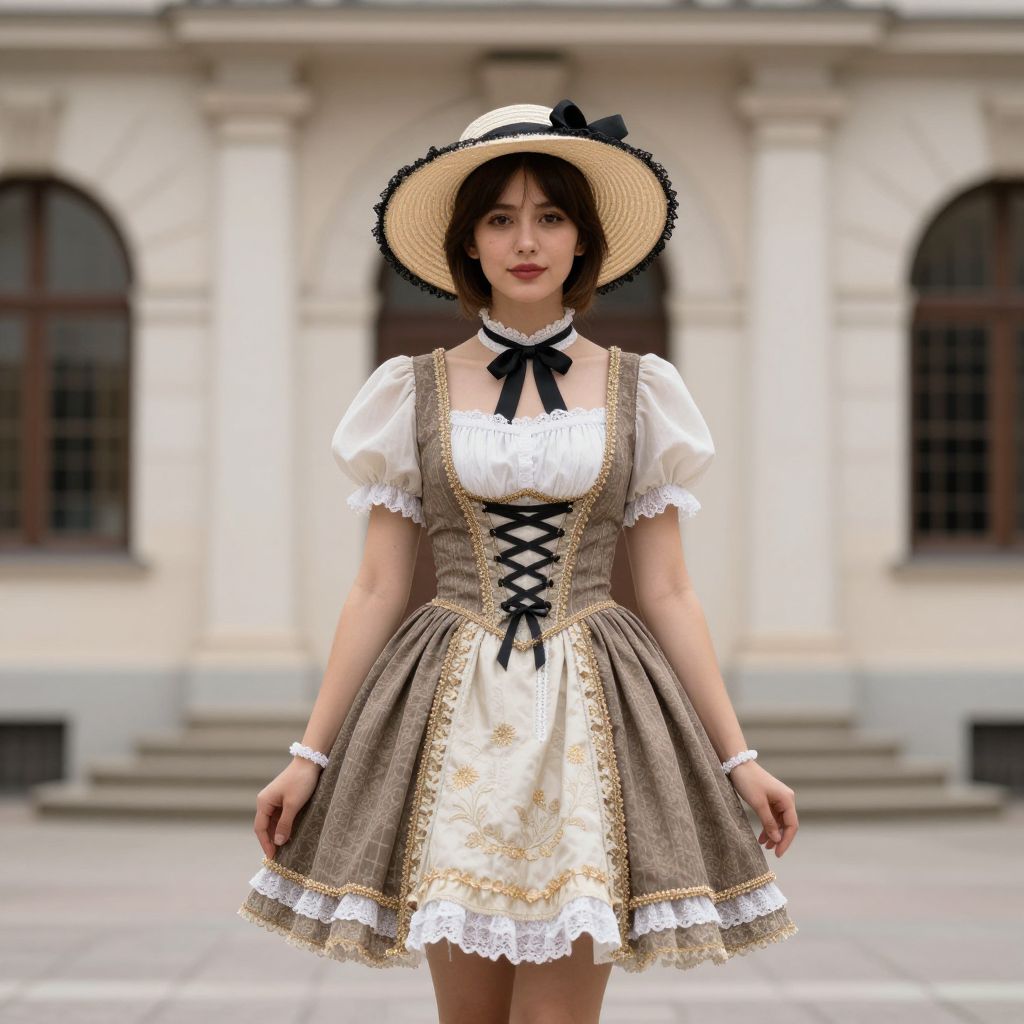 This is a digital rendering of a young woman standing in front of a classical building with arched windows. She has light skin and short, dark brown hair, and is wearing a large, straw sunhat with a black ribbon. Her outfit is a vintage-style dress with a brown, patterned bodice and white, puffed sleeves, featuring black lace-up details and a white lace trim. She also wears a black ribbon choker and a white wrist cuff on her right wrist. The dress has a short, flared skirt with a white lace underskirt. The background is slightly blurred, emphasizing the subject.