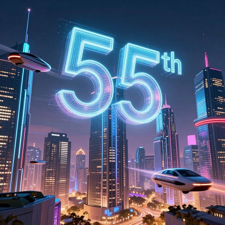 Futuristic city skyline celebrating the 55th year of establishment, with holographic '55th' signs floating in the air, sleek flying vehicles, neon lights reflecting on glass skyscrapers, dynamic and ultramodern design, vibrant color palette