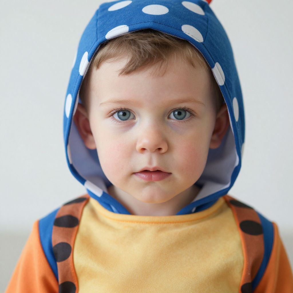 Photograph of a fair-skinned, blue-eyed toddler with light brown hair, wearing a blue polka-dot hooded costume over an orange shirt,