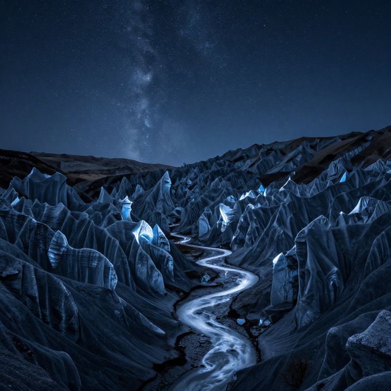Under a starlit sky, jagged peaks of ice and rock twist into impossible forms, as if sculpted by the whims of a cosmic artist, while a serpentine river of light winds through the valley, defying the laws of gravity and illumination.