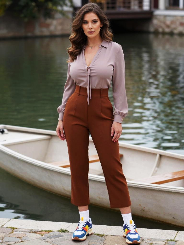 A busty woman in a casual chic tie-dye sweatshirt in pastel orange and pink, paired with high-waisted vertical striped trousers in white and beige, accessorized with a delicate necklace, holding a lime green mesh tote bag, standing on a luxury boat in the Norwegian Fjords, visual style: Cibachrome. Sexy. Pretty face and beаutiful eyes. Big breasts