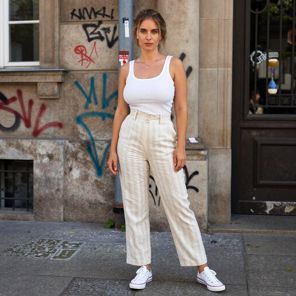 Photograph of a blonde woman with wavy hair, wearing a pink-orange tie-dye sweater and high-waisted white striped pants, standing on