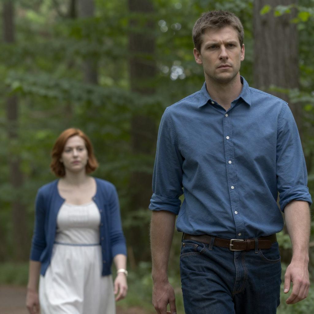 Photograph of three people in a forest. Two men with blonde hair, one in a light blue shirt and gray pants, the other in a white shirt and brown pants, hold hands with a woman in a yellow dress. The men appear tense, while the woman looks serious. The background is dense green foliage.