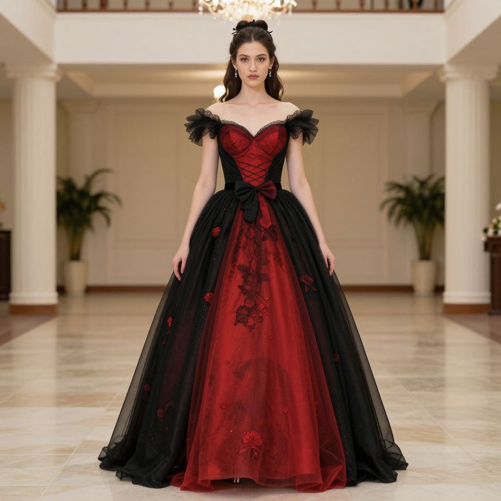 Black And Red Princess Dress, woman in a red and black dress standing in a hall