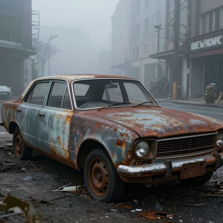 Wertverlust visualized by a depreciating vintage car rusting and fading into a foggy, dystopian urban environment, somber color palette, moody atmosphere, detailed textures highlighting decay and loss.