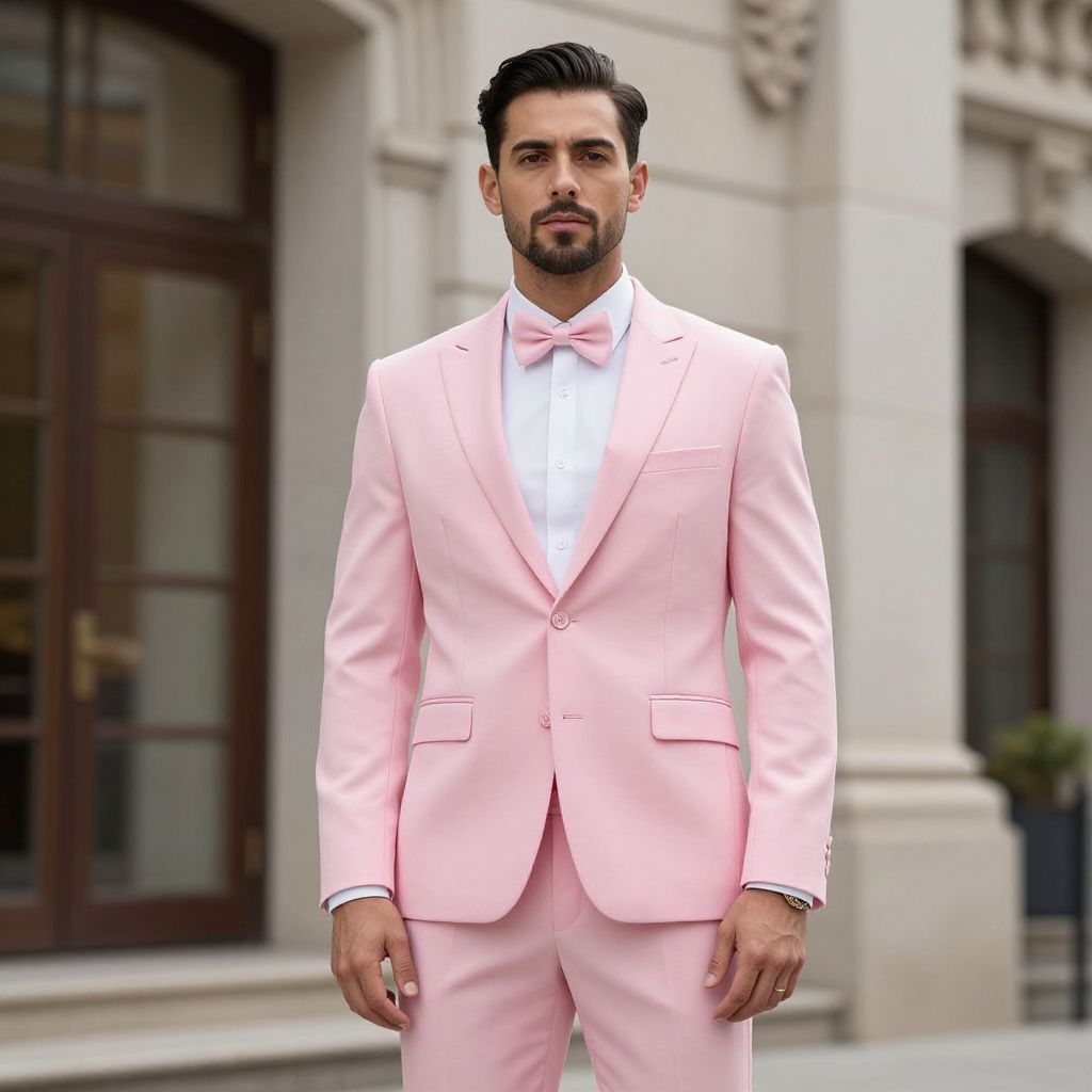 Pink Man Clothing Costume, man standing in front of a building wearing a pink suit