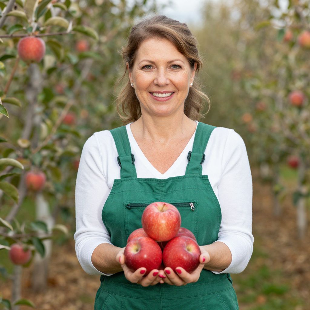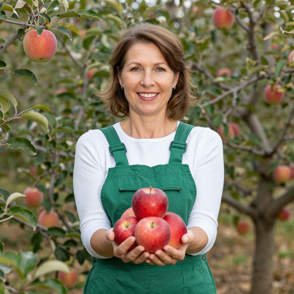 Joyful mature woman in green overalls and a white shirt stands amidst an apple orchard, cradling a handful of vibrant red apples in her hands while smiling warmly.