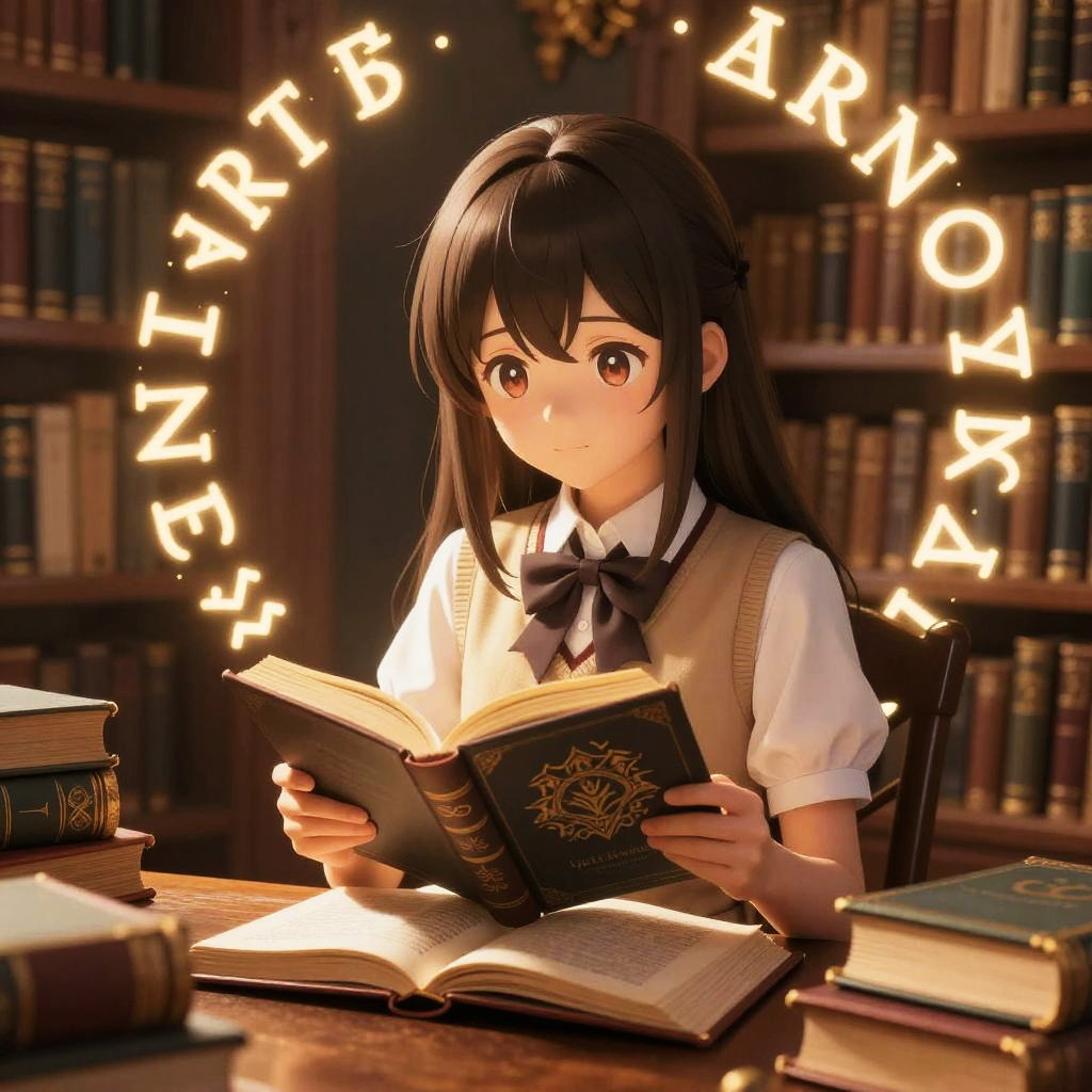 Stable diffusion loli in a magical library, surrounded by ancient books and glowing runes, wearing a charming school uniform with a bow tie, reading an open spellbook, warm golden light casting soft shadows, anime style with sharp details.