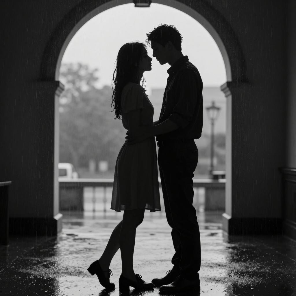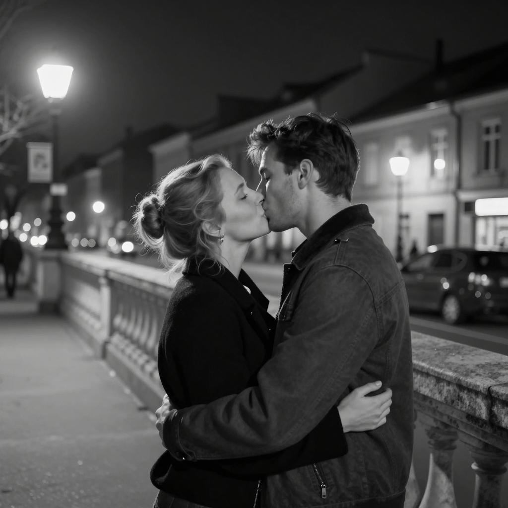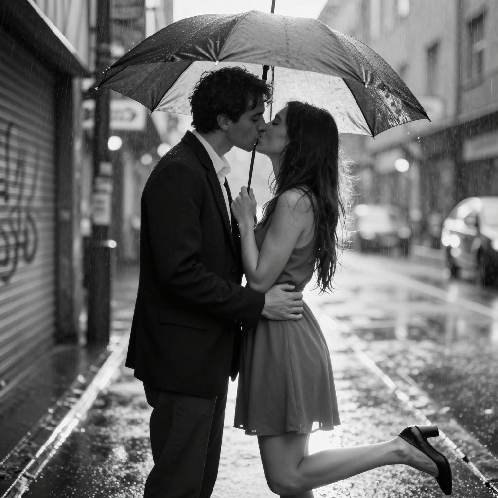 Black and white photo of a couple standing on a wet sidewalk. Man with short dark hair, light shirt, and sweater. Woman with long curly hair, dark jacket, and track pants. She leans in, head tilted, kissing his cheek. Cars and buildings in background. New York City license plate visible on car. Both standing close, facing each other.