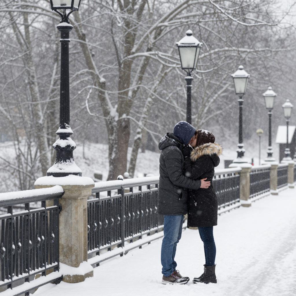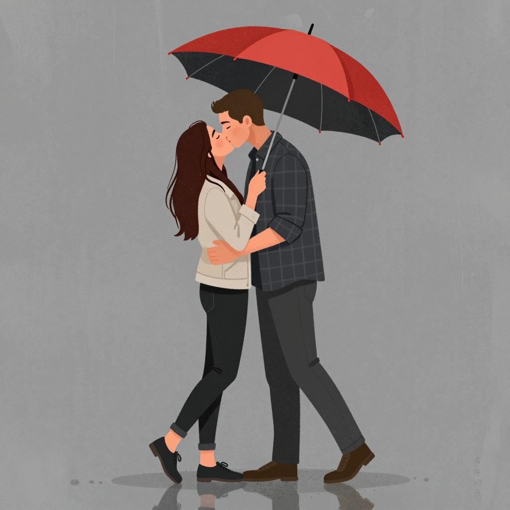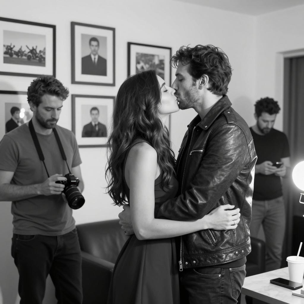 Black and white photo of a couple standing on a wet sidewalk. Man with short dark hair, light shirt, and sweater. Woman with long curly hair, dark jacket, and track pants. She leans in, head tilted, kissing his cheek. Cars and buildings in background. New York City license plate visible on car. Both standing close, facing each other.