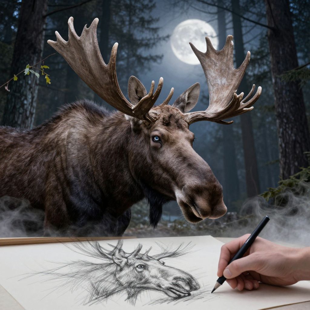 Majestic moose portrait, moonlit forest scene, silvery moonbeams casting ethereal shadows on ancient trees, artist's hands moving deftly across parchment, charcoal strokes capturing majestic antlers, gentle breeze rustling leaves, soft focus, dreamlike ambiance, captivating gaze, serene silence. Man has masculine face and piercing eyes