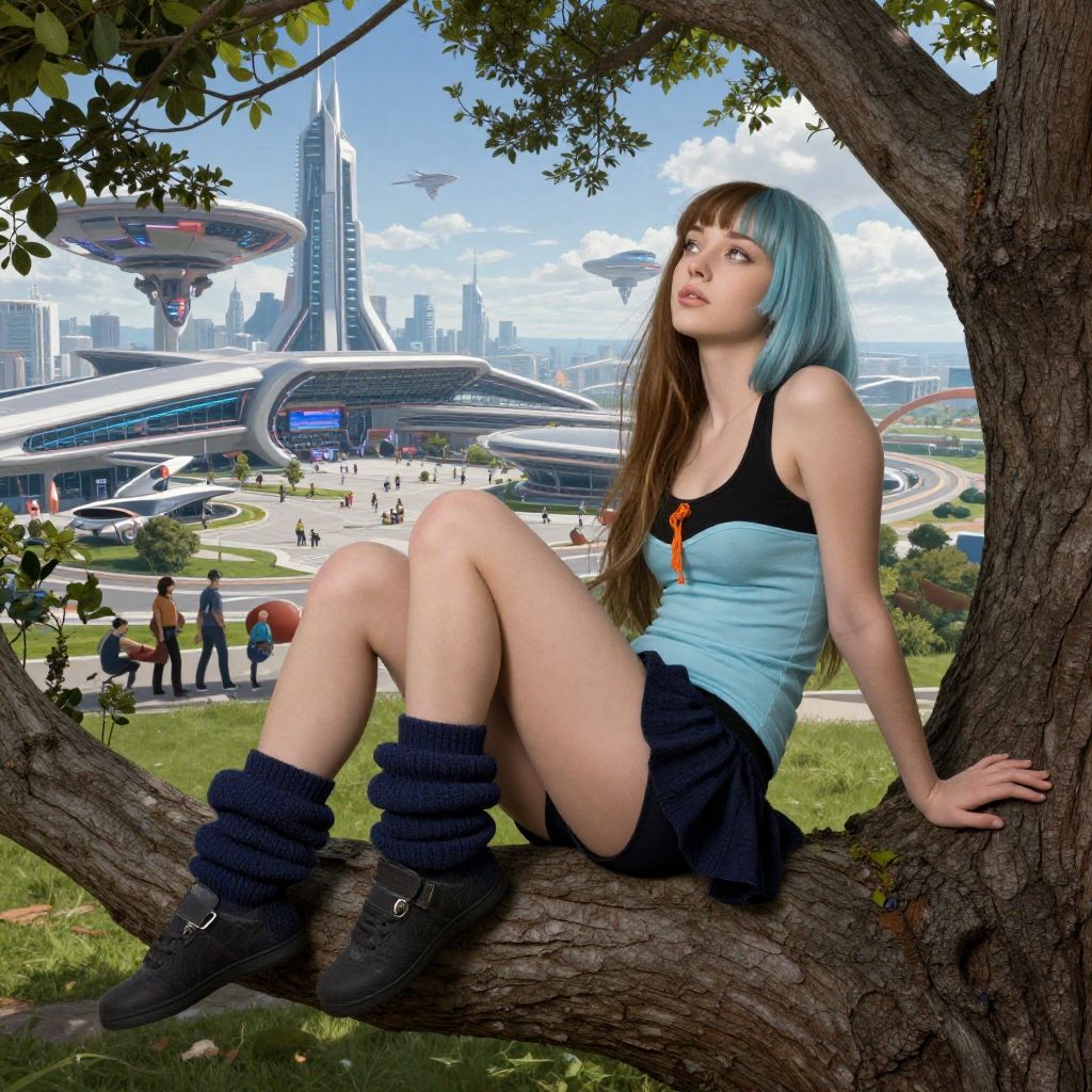 A 25 year old woman sitting on a tree branch in a park with her legs crossed and her head tilted back, looking to the side, amanda seyfried, portrait photography, a picture, american barbizon school masterpiece, best quality, intricate detail, photorealistic, volumetric lighting, 8k, post-processing, a highly detailed matte painting of a futuristic city with a futuristic airport and a cityscape, by andreas rocha and john howe and james gurney and james jean, photo of a futuristic alien in his spaceship, sci fi ├в┬Ч┬П, digital art, trending on artstation, 8 k, highly detailed, hd, hdr, 4 k, a very beautiful anime girl, full body, long brown hair with bangs, short blue light blue hair, black tank top, short skirt, light blue tank top, puffy socks, dark blue