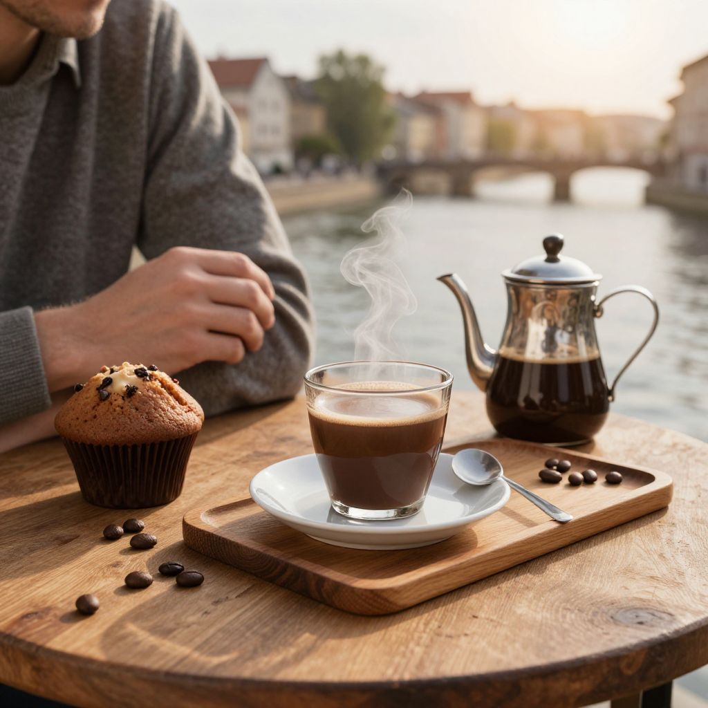 Photograph of a wooden table outdoors by a river at sunset. A person with light skin and wearing a gray sweater, only their torso and hands are visible, sits on the left. On the table, there's a glass of hot chocolate with steam rising, on a white saucer with a silver spoon, a wooden tray, a silver teapot, and a chocolate-studded muffin. Scattered chocolate pieces are on the table. The background shows a blurred river and cityscape with buildings and trees, bathed in warm, golden light.