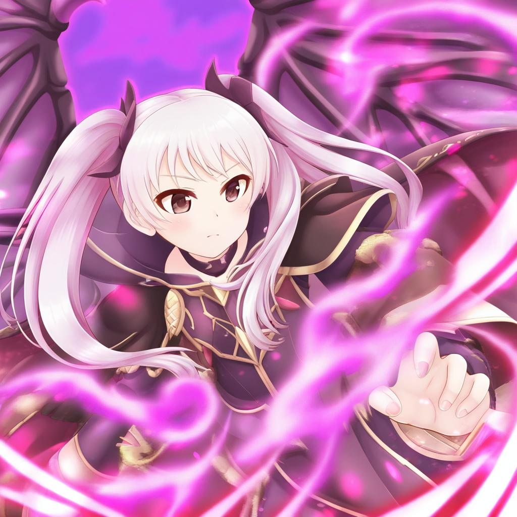 Digital anime-style illustration of Grima from Fire Emblem with white long hair styled in twintails and red eyes. She is wearing detailed dark armor with gold accents and large, bat-like wings. The character is surrounded by swirling pink magical energy against a purple background, showcasing a dynamic and intense pose with an outstretched hand.