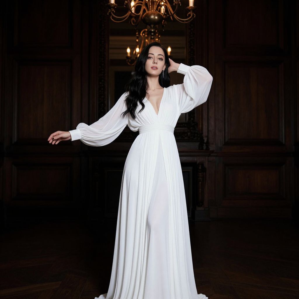 Photograph of a woman with long, dark hair standing in a dimly lit, elegant room with dark wooden walls and ornate chandeliers. She's wearing a flowing, white, V-neck gown with puffy sleeves. She's posed with one hand on her head and the other outstretched, looking confident and stylish. The background is shadowy, emphasizing her bright attire.