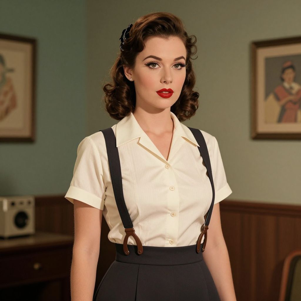 A vintage-inspired digital illustration featuring a woman in a classic 1950s-style outfit, complete with a blouse and suspenders, set against a retro interior backdrop with dramatic lighting and a nostalgic charm reminiscent of mid-century Americana.