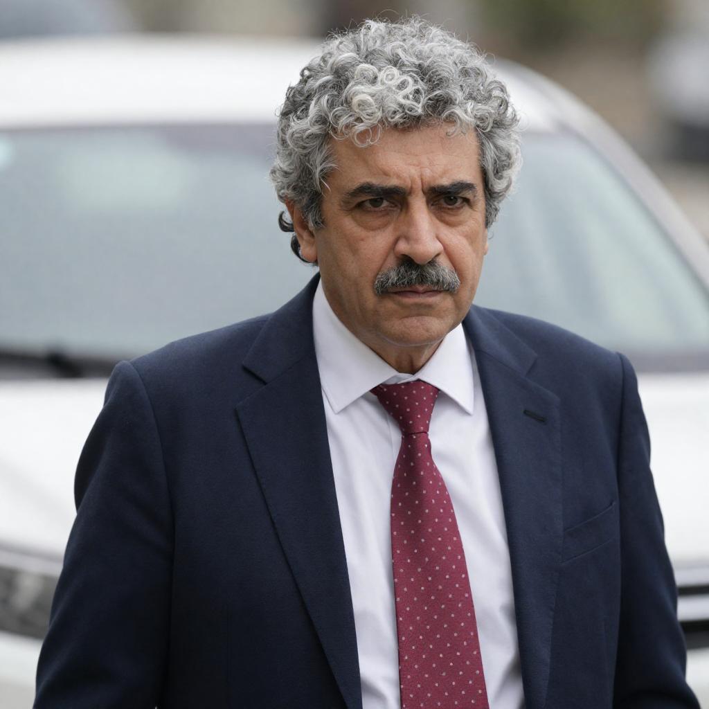 Photograph of a middle-aged man with curly gray hair and a mustache, wearing a dark blue jacket over a white shirt and red polka-dot tie. He stands outdoors with a blurred white vehicle in the background, looking slightly to the side with a serious expression.