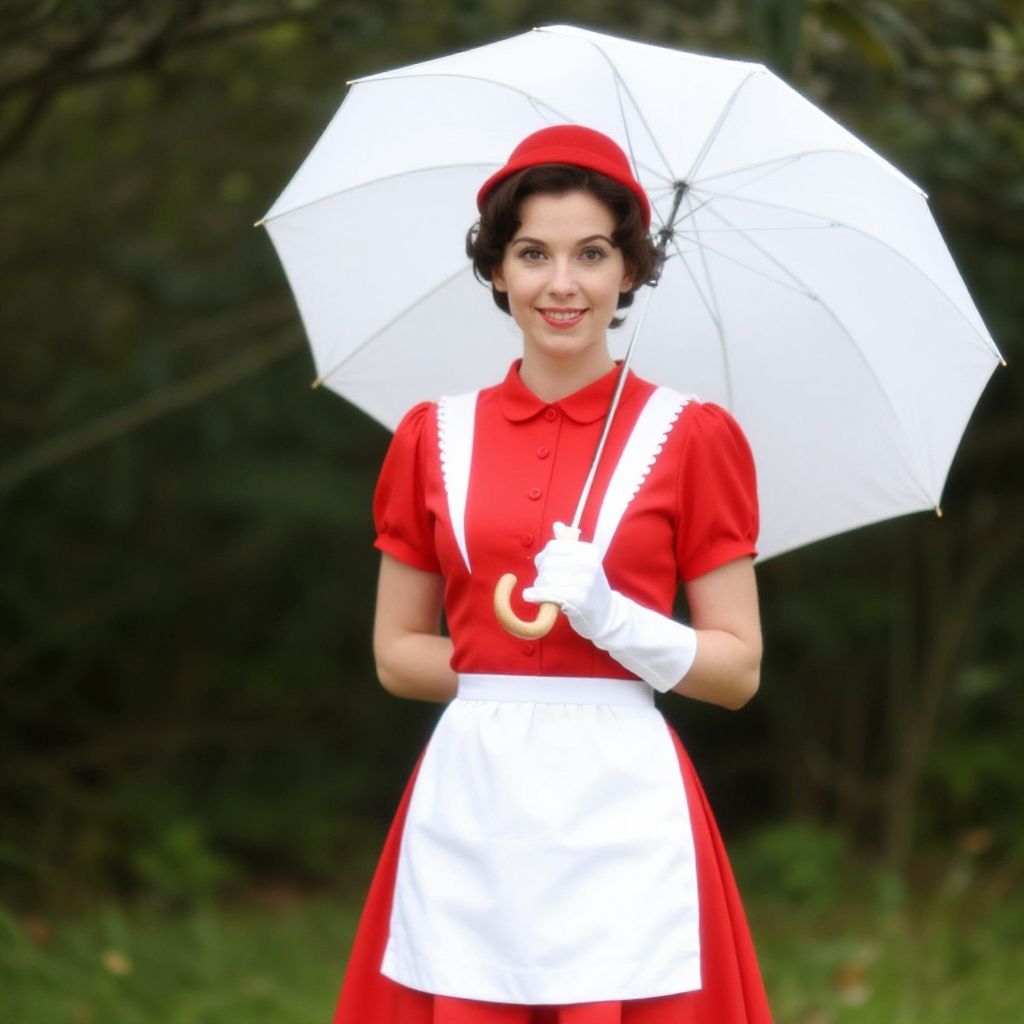A woman dressed in a vintage Mary Poppins-inspired costume stands in a lush garden setting, holding a white parasol. She wears a red dress with a white apron, complemented by white gloves and a matching hat, embodying the classic early 20th-century style with a cheerful and poised demeanor.