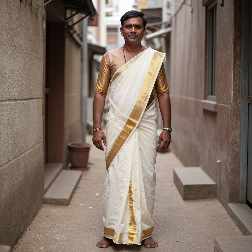 Photograph of a medium-built, dark-skinned Indian man with short black hair, standing in a narrow, urban alleyway. He is wearing a white silk saree with a gold border, draped over a gold-colored, short-sleeved shirt. His bare feet are visible on the concrete ground. He has a silver bracelet on his right wrist and a necklace. The alley is flanked by beige concrete walls, with a small potted plant to the left and a rectangular stone step to the right. The background is slightly blurred, highlighting the man as the focal point. The lighting is natural, with a slight shadow cast.