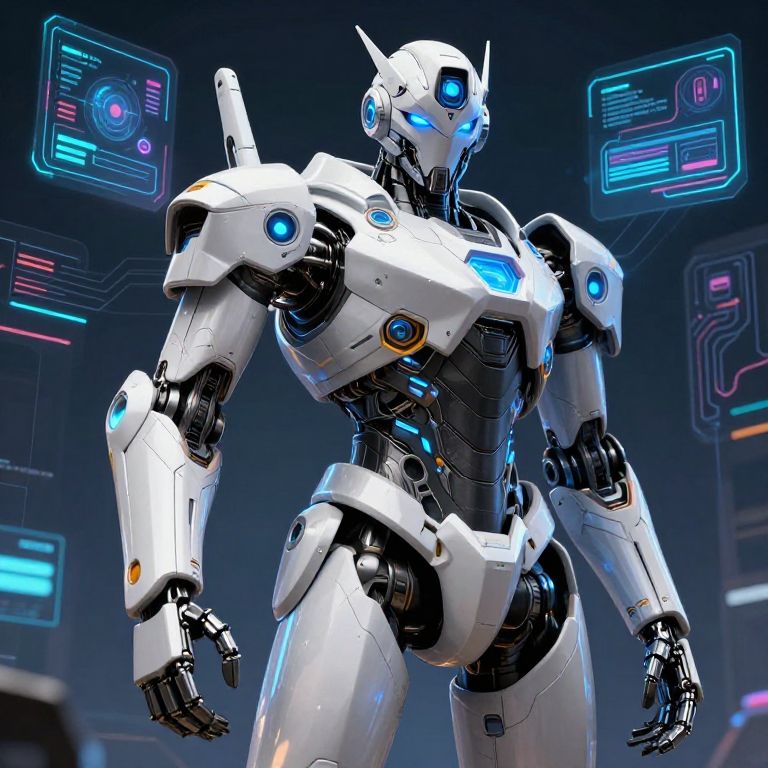 Photorealistic CGI image of a futuristic, white, humanoid robot with blue glowing accents and black internal components. The robot has a sleek, angular design with illuminated blue eyes, and various blue and orange circular lights on its chest and joints. It stands in a high-tech, dark blue-lit environment with neon-colored holographic screens displaying data and interfaces in the background. The robot's joints are articulated, and its body has a glossy, metallic texture. The overall style is reminiscent of cyberpunk aesthetics. The robot's posture is confident and strong, with arms slightly bent at the elbows.