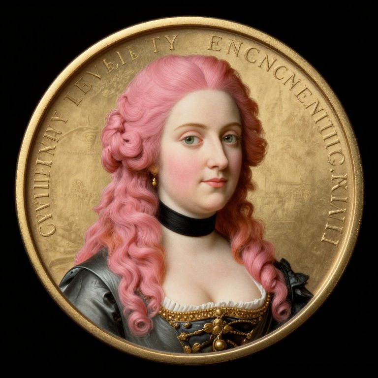 Genetic Engineering XVIII Century miniature portrait in a medallion of a pink hair French girl with a black chocker in her 20s with auburn hair, green eyes, 18th century clothing,