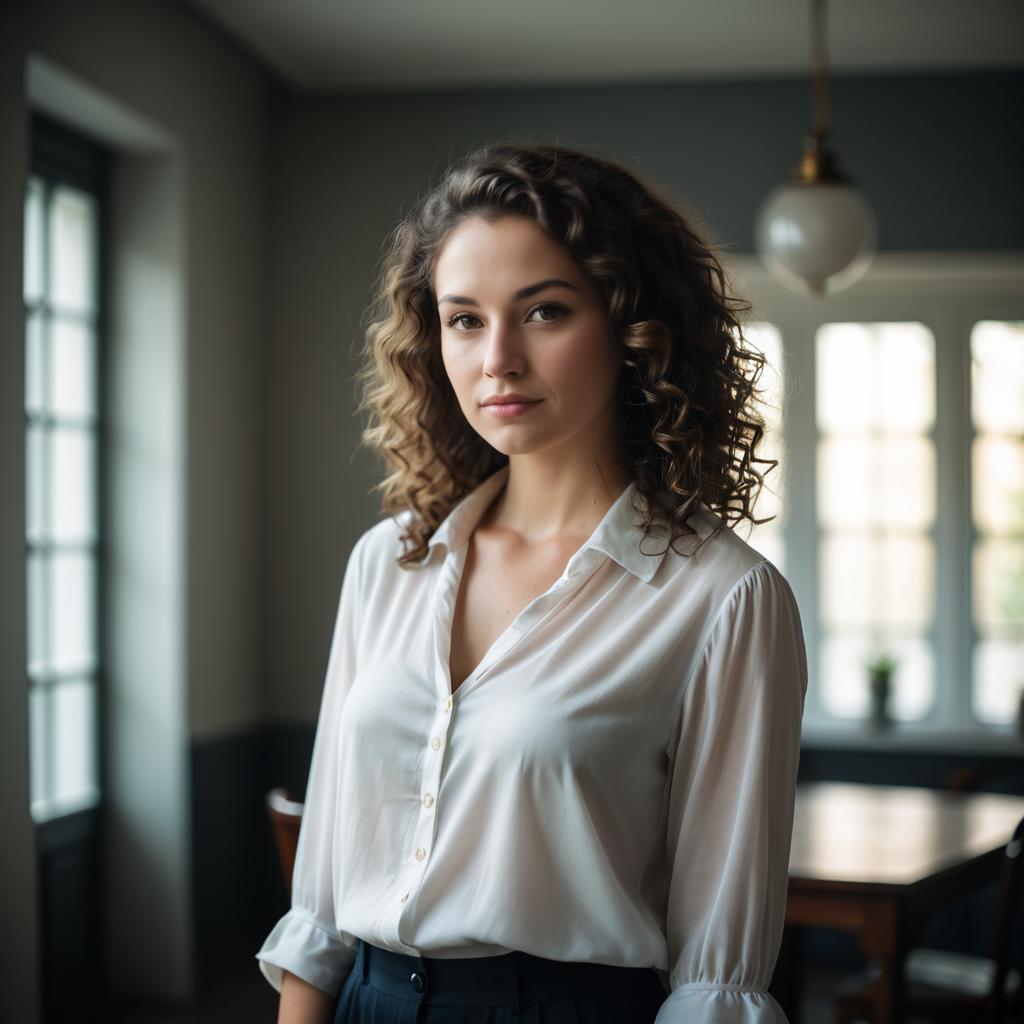 Portrait of a young woman with curly brunette hair and natural makeup, wearing a white blouse. She stands indoors in soft moody lighting with deep shadows, creating a cinematic and realistic photographic style with cool and muted colors.