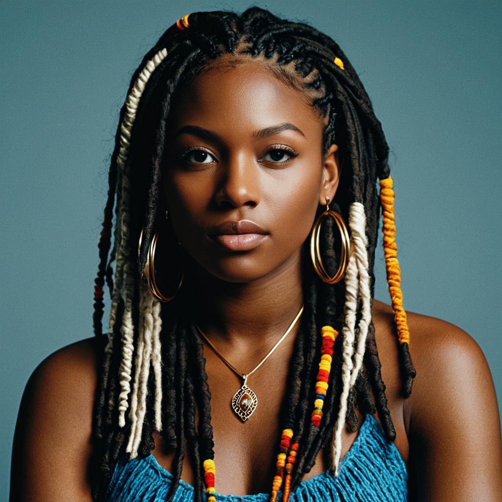 Butterfly braids locs long,jewelry, solo, dreadlocks, 1girl, earrings, realistic, necklace, brown background, looking at viewer, long hair, multiple braids, brown hair, upper body, dark skin, lips, closed mouth