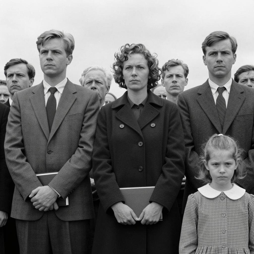 People on stone steps, mid-action scene. Blonde man in brown jacket, black floral skirt, lifted by woman in red sweater, dark hair in bun. Woman has white blouse, green sweater-clad woman to left, hands raised. Children in background, some clapping, some surprised. Casual 1960s clothing. Expressions: surprise, excitement. 8 people. Stairs in center background.