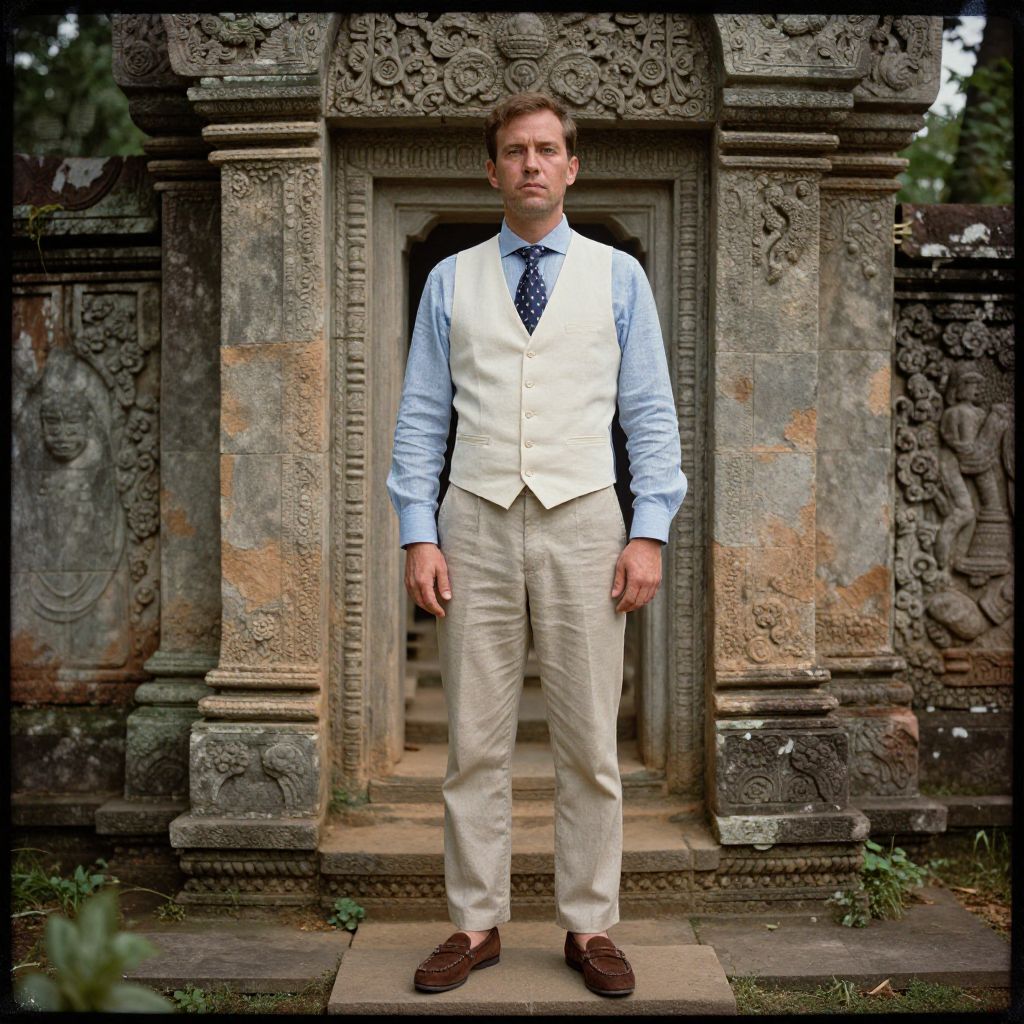 A man, light blue linen dress shirt, cream cotton waistcoat, beige chinos, brown suede loafers, patterned silk tie in navy, ancient stone temple, intricate carvings, surrounded by lush greenery, calotype process, contemplative expression. Man has masculine face and piercing eyes