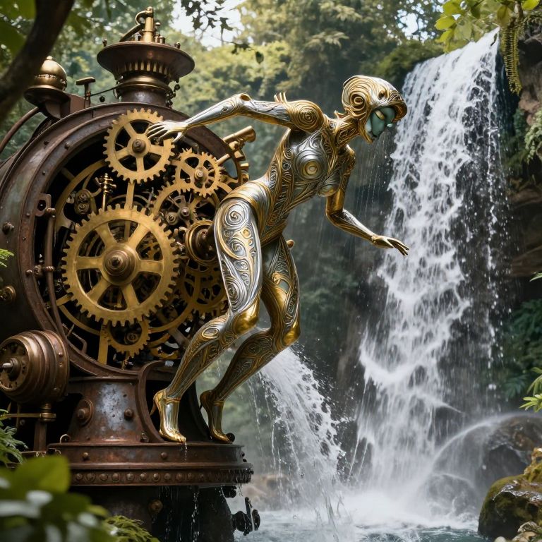 A captivating blend of steampunk and Art Nouveau design elements brings to life an enchanting scene where a clockwork automaton teeters on the brink of a mesmerizing waterfall gushing from an antique, rusted machine. The intricate network of brass gears and levers within this mechanical wonder gleam under the sunlight that pierces through the verdant foliage enveloping its colossal structure. The automaton itself is crafted with exquisite detail, featuring silver and gold filigree patterns that echo the fluid curves of Art Nouveau, mirroring the undulating motion of the water. As it leans forward, the internal mechanisms rev up, harmonizing with the steady rhythm of the falls; this creates a mysterious interplay between mankind's creativity and nature's enduring allure, sparking a sense of awe and intrigue for the untold tales woven into this delightful melding of Victorian ingenuity and Art Nouveau grace.