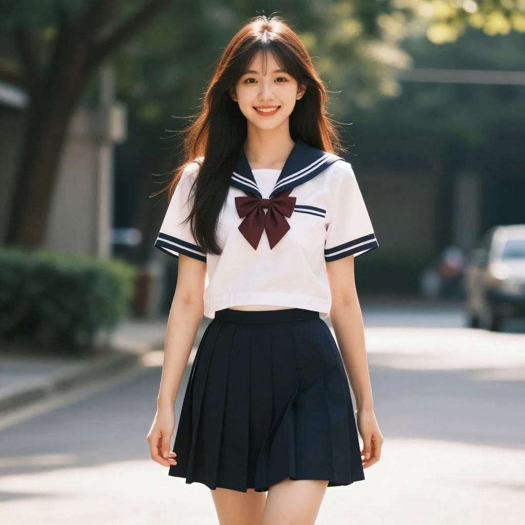 Photograph of an Asian woman with long black hair, wearing a white sailor-style school uniform with a black bow and pleated skirt, smiling on a
