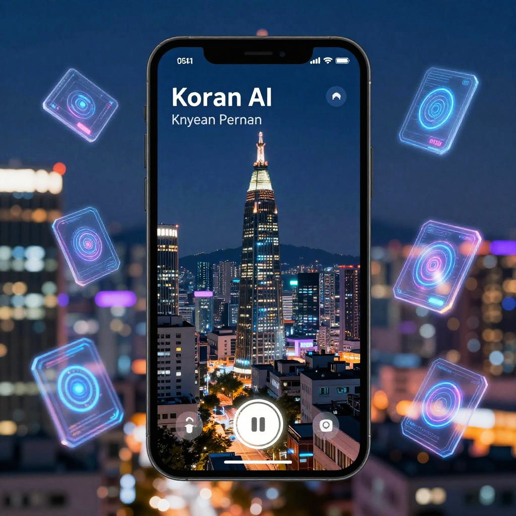 Korean AI app showcasing a futuristic smartphone interface with vibrant Seoul cityscape in the background, holographic AI elements floating around, sleek user interface design, glowing neon colors, cyberpunk aesthetic, high detail and ultra-realistic style.