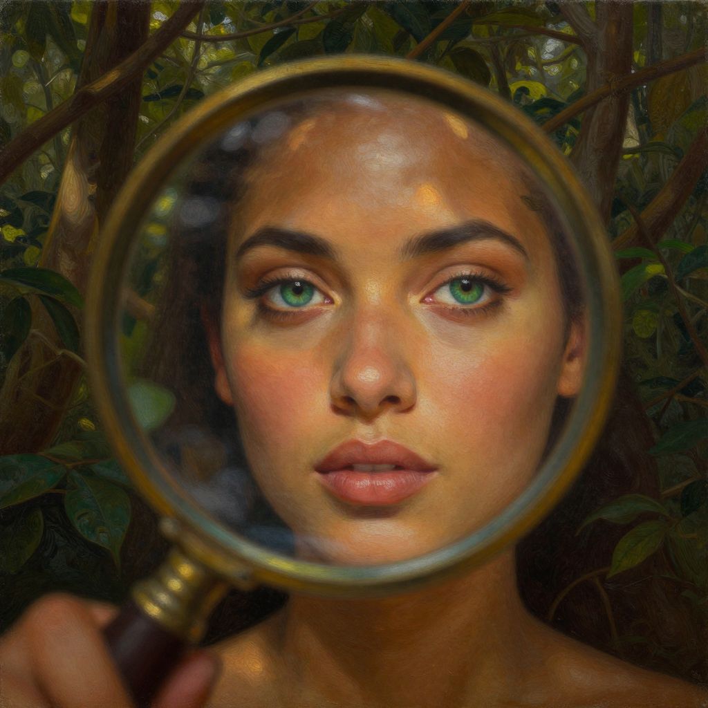 This is a digital painting of a young woman with olive skin, green eyes, and full lips, gazing intently through a magnifying glass held in the foreground by an unseen hand. Her face is illuminated, highlighting her smooth complexion and defined eyebrows. The background is a dense, dark forest with lush green leaves and branches, creating a contrasting, shadowy backdrop. The magnifying glass slightly distorts her features, emphasizing her focused expression. The painting style is realistic with rich, vibrant colors and detailed textures, creating a sense of depth and realism.