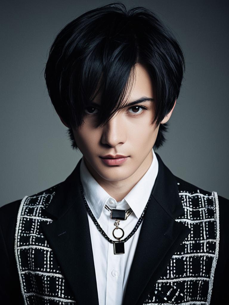 Photo-realistic cosplay photo of person in artem wing (tears of themis) costume. 1boy, blue eyes, brown hair, short hair, white shirt, collared shirt, black jacket, long sleeves, formal. full body shot