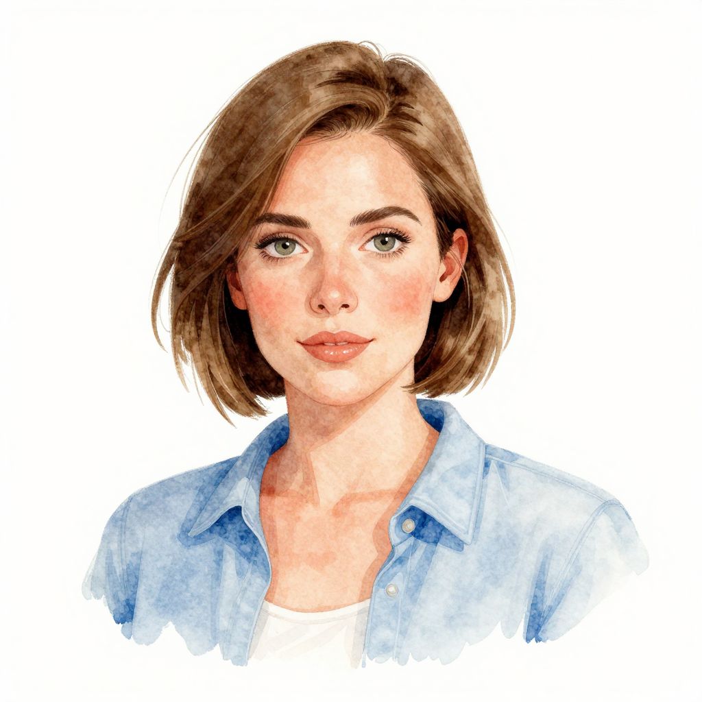 Watercolor portrait of a young woman with short brown hair, light blue eyes, and a light blue button-up shirt, smiling softly against a white background