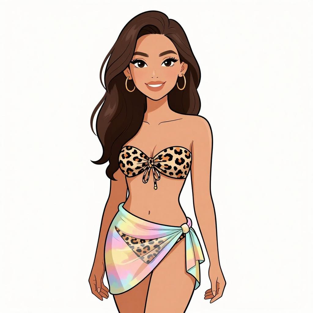 Digital illustration of a confident woman with long brown hair, wearing a blue bikini, large hoop earrings, and smiling, standing against a white background.