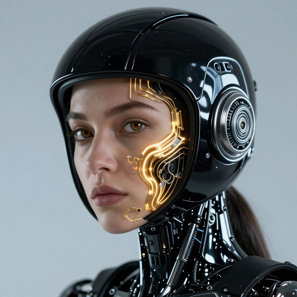 Photorealistic CGI image of a young woman with pale skin and dark brown eyes, wearing a shiny, black, futuristic helmet with intricate, glowing, orange circuits on the left side. Her face is partially visible, showing a calm, focused expression. The helmet has large, circular, silver accents on the sides. She has dark brown hair pulled back, and the background is a simple, gradient light blue. The image blends realistic human features with sci-fi elements, emphasizing the contrast between her natural face and the advanced, robotic helmet.