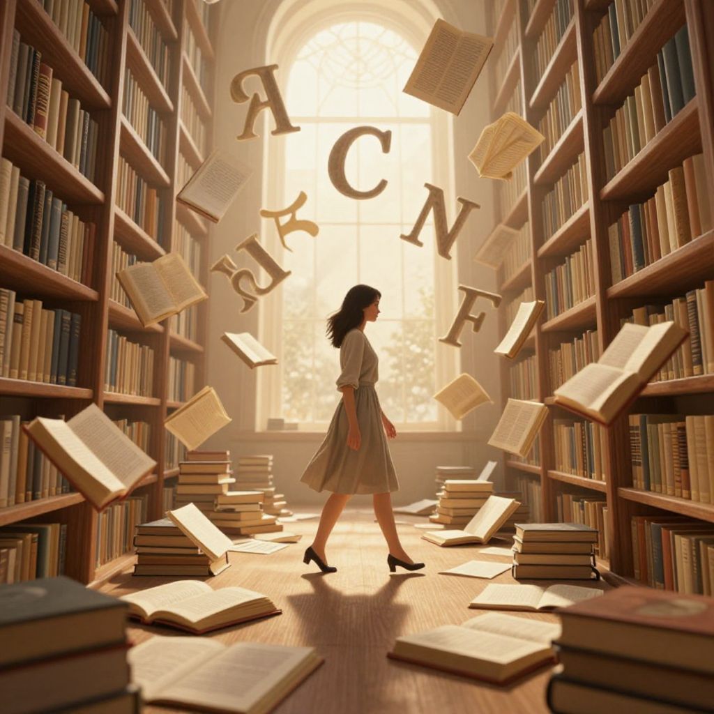 A surreal, computer-generated illustration depicts a woman walking through an enchanting library where books are scattered across the floor, their pages open as if animated by living alphabets dancing under golden-hour lighting, evoking a dreamlike, high-definition fantasy world.