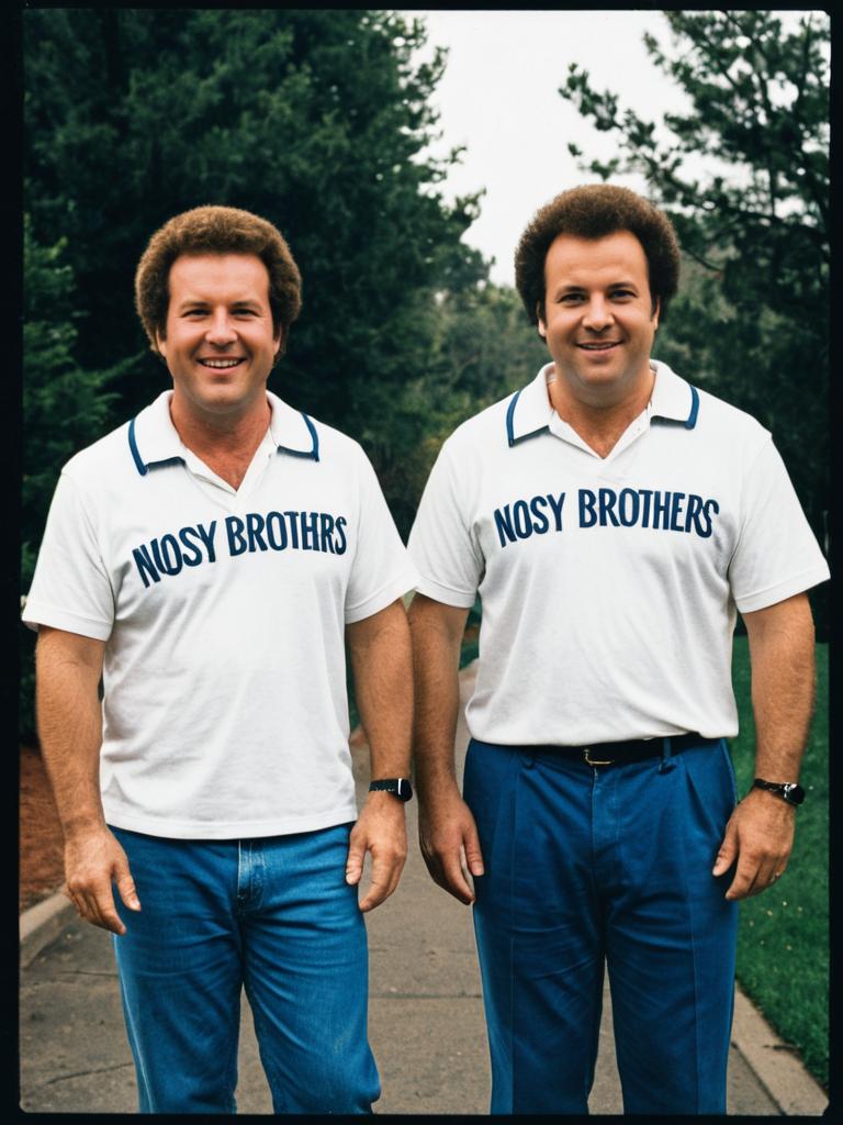 Two men dressed in blue 'Noisy Brothers' sports jerseys standing outdoors in front of a suburban yellow house with green shutters. Both men have curly dark hair and are smiling, representing a humorous, photorealistic portrayal inspired by the Step Brothers movie.