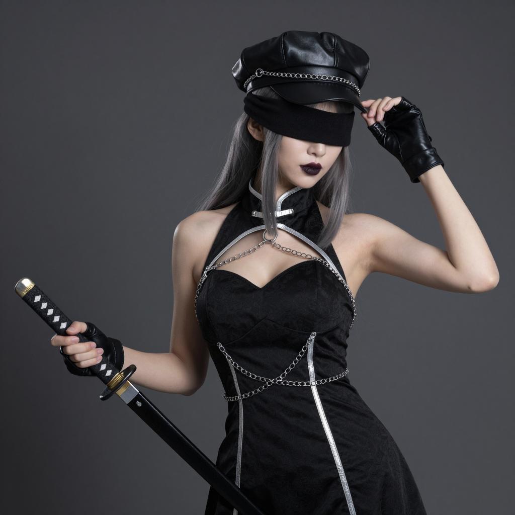Woman with gray hair, black horns, and skull mask stands in forest holding katana over right shoulder. She wears black sleeveless dress with red lining, black gloves, and fishnet stockings. Her expression is intense. Background includes trees and grass. She holds another katana in left hand. Forest floor has rocks.