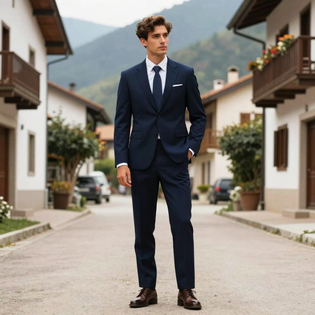 Photograph of a young Caucasian man with curly brown hair, standing confidently in the center of a quaint village street. He is wearing a dark navy blue suit with a white dress shirt and black tie, and brown leather dress shoes. His left hand is in his pocket, and he gazes to the right. The background features white, two-story buildings with brown wooden balconies and flower pots, and a misty mountainous landscape. Cars are parked on either side of the street, and the pathway is lined with small green plants. The overall scene is bright and clear.