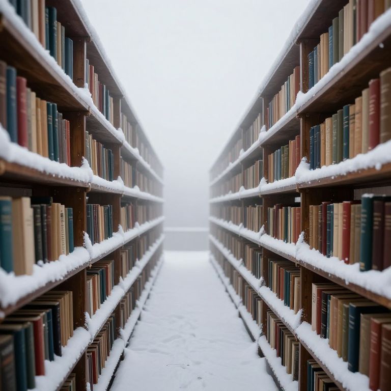 Photograph of a snow-covered library aisle with two long, wooden bookshelves on either side, filled with various colored books. The shelves are dusted with snow, and the aisle is blanketed in a thick layer of white snow, creating a serene winter scene. The photograph is taken from the center of the aisle, leading the viewer's eye towards a bright, overexposed background, giving a sense of depth and perspective. The color palette includes muted browns, greens, and reds from the books, contrasted with the white snow.