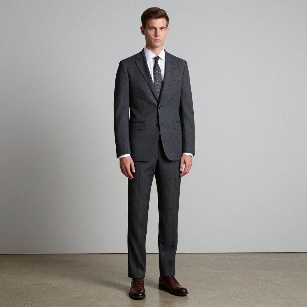 Photograph of a young white man standing confidently in a minimalist studio. He has short brown hair, a serious expression, and is wearing a dark gray, textured suit with a white dress shirt and a patterned dark tie. His brown leather shoes are polished, and he stands on a plain concrete floor against a light gray wall.