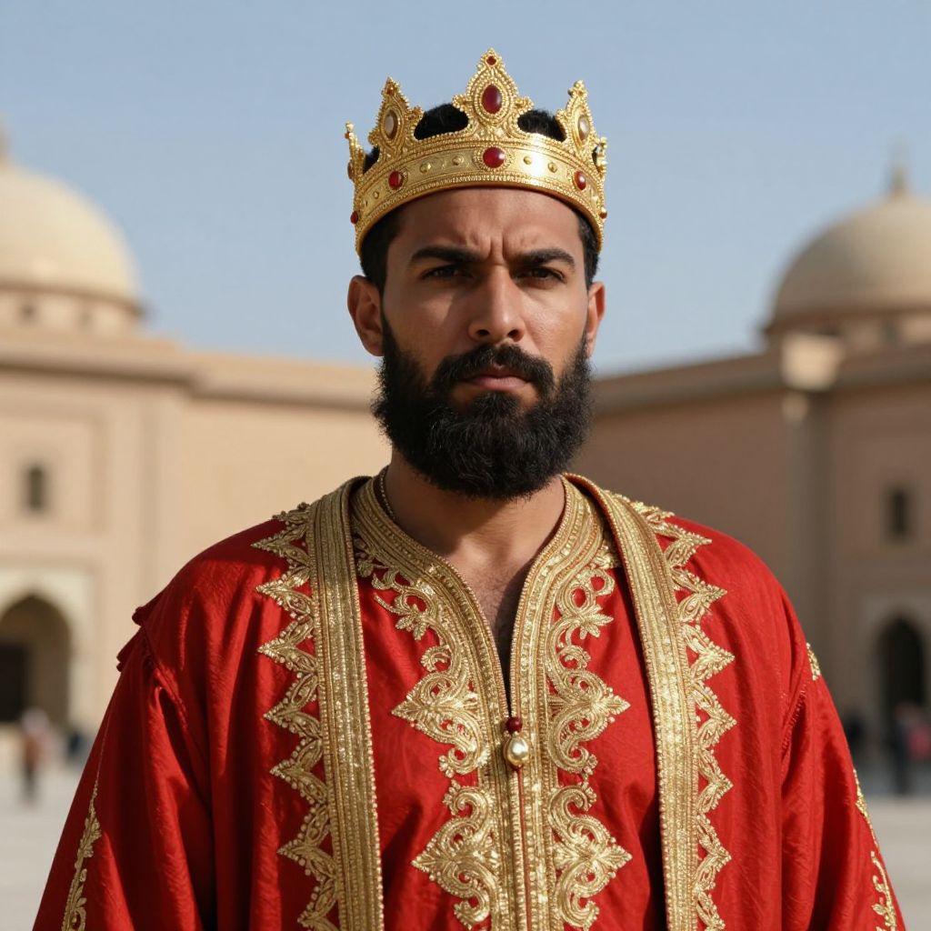 Photograph of a bearded man with a serious expression, wearing an ornate golden crown and a vibrant red robe with intricate gold embroidery. He stands in front of a blurred, historical-looking building with domes and tan walls. The man has dark skin, and the background suggests an outdoor setting with a clear, blue sky. The image has a slightly realistic, digital art style.