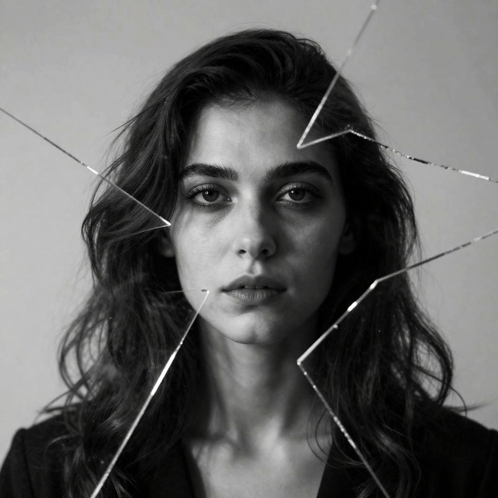 This is a high-contrast, black-and-white digital portrait of a woman with dark, wavy hair. Her face is partially obscured by broken, jagged glass fragments that are scattered across the image. The background is a textured, abstract pattern, adding depth and intensity to the composition. Her expression is neutral, and the lighting creates dramatic shadows, enhancing the overall moody, surreal atmosphere.