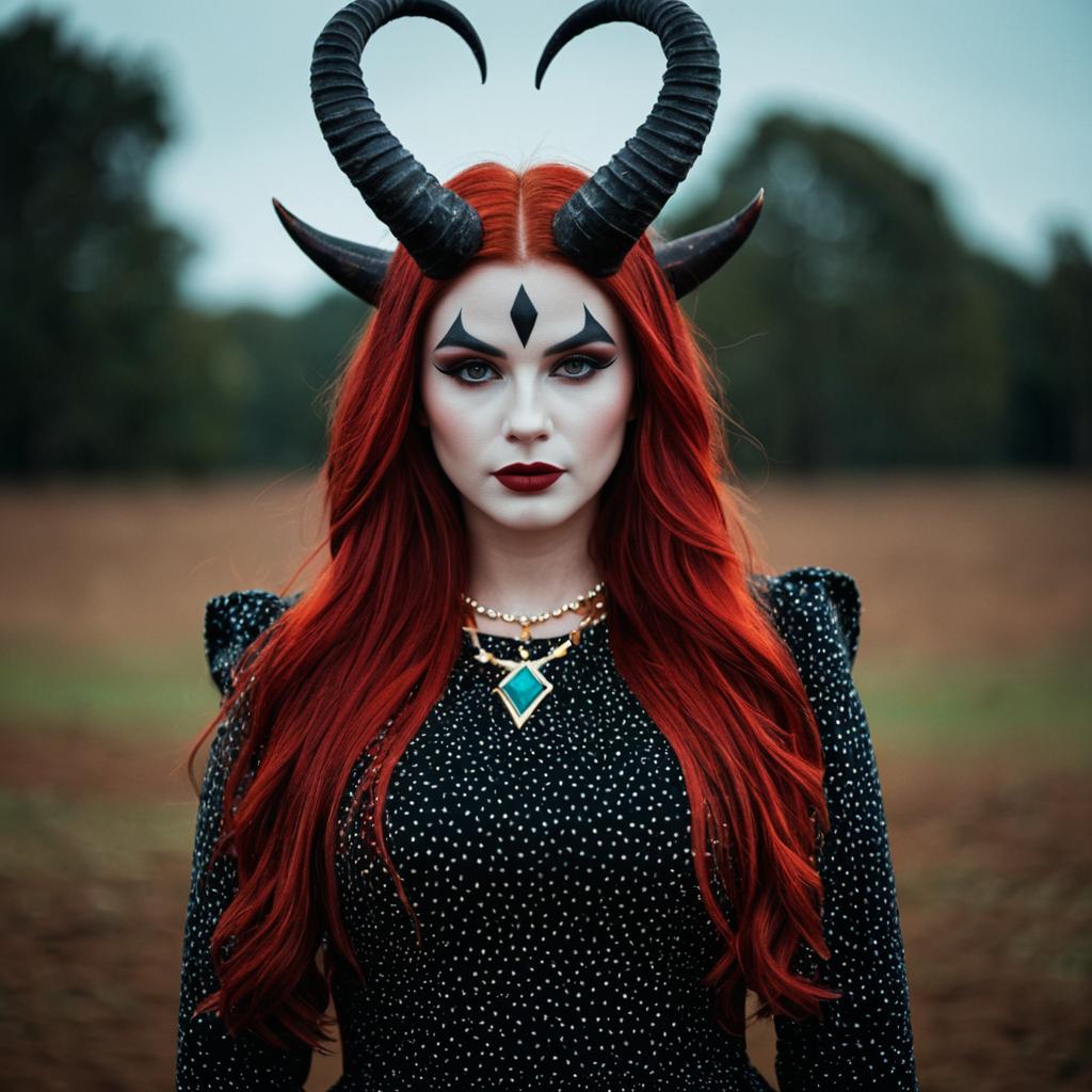 Portrait of a woman wearing a jesterina-inspired costume featuring large curved black horns. She has long, vibrant red hair and is dressed in a black, long-sleeve dress with small white dots. Her makeup is dramatic with bold eyebrows and dark red lipstick. She is accessorized with a distinctive necklace and has a mole under her eye. The background is a blurred outdoor setting.