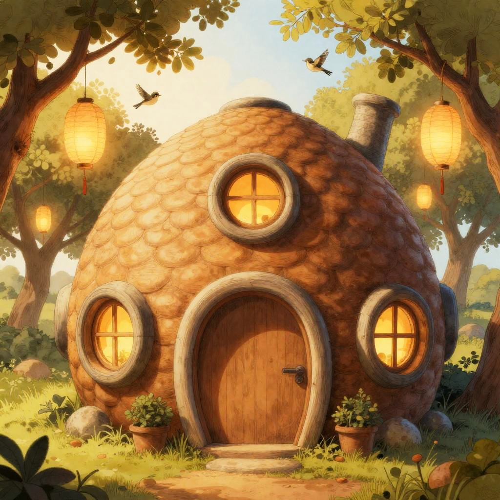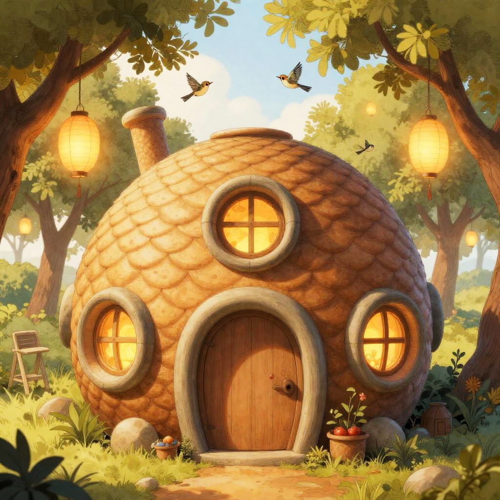 A fantasy architectural illustration featuring a whimsical beehive-shaped cottage with intricate scale-like textures, a large curved doorway, and round windows emitting cozy warm light, surrounded by sun-dappled orchard with hanging paper lanterns and fluttering songbirds, rendered in a intricate ink-and-gouache hybrid with warm luminous highlights style, evoking a magical and inviting atmosphere.