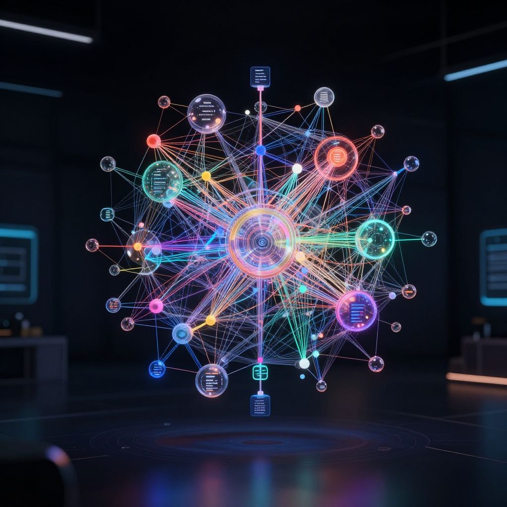 ComfyUI SDXL workflow visualized as an intricate network of colorful, semi-transparent nodes and data streams floating in a dark, modern tech space, emphasizing clarity and fluidity with neon accents and subtle reflections.