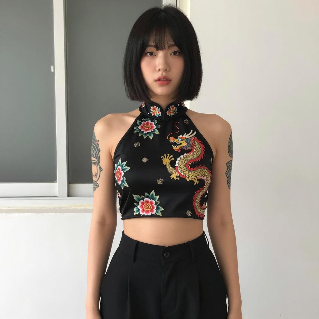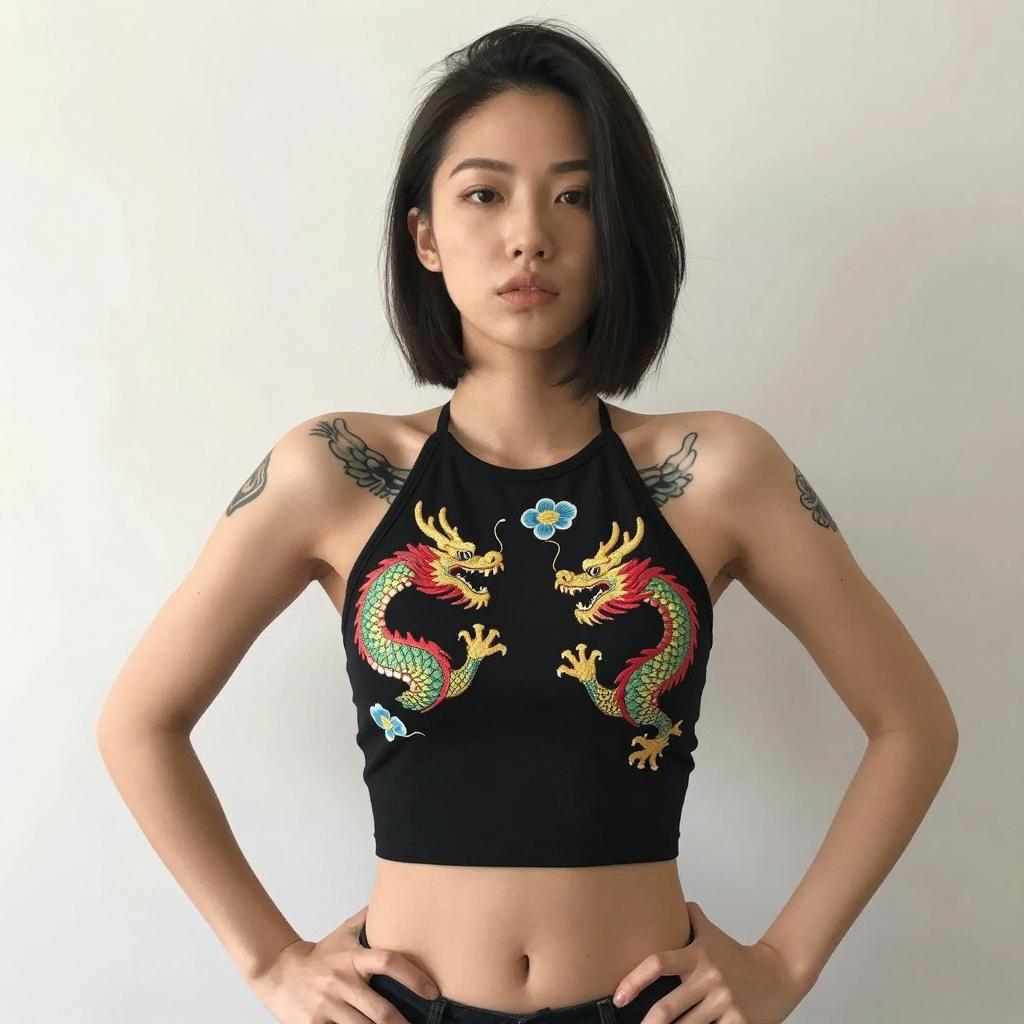 Asian woman with short black hair, wearing a black halter crop top with colorful dragon embroidery, exposing her midriff and tattoos on both shoulders. Her hands rest on her hips. The background is a plain white wall.