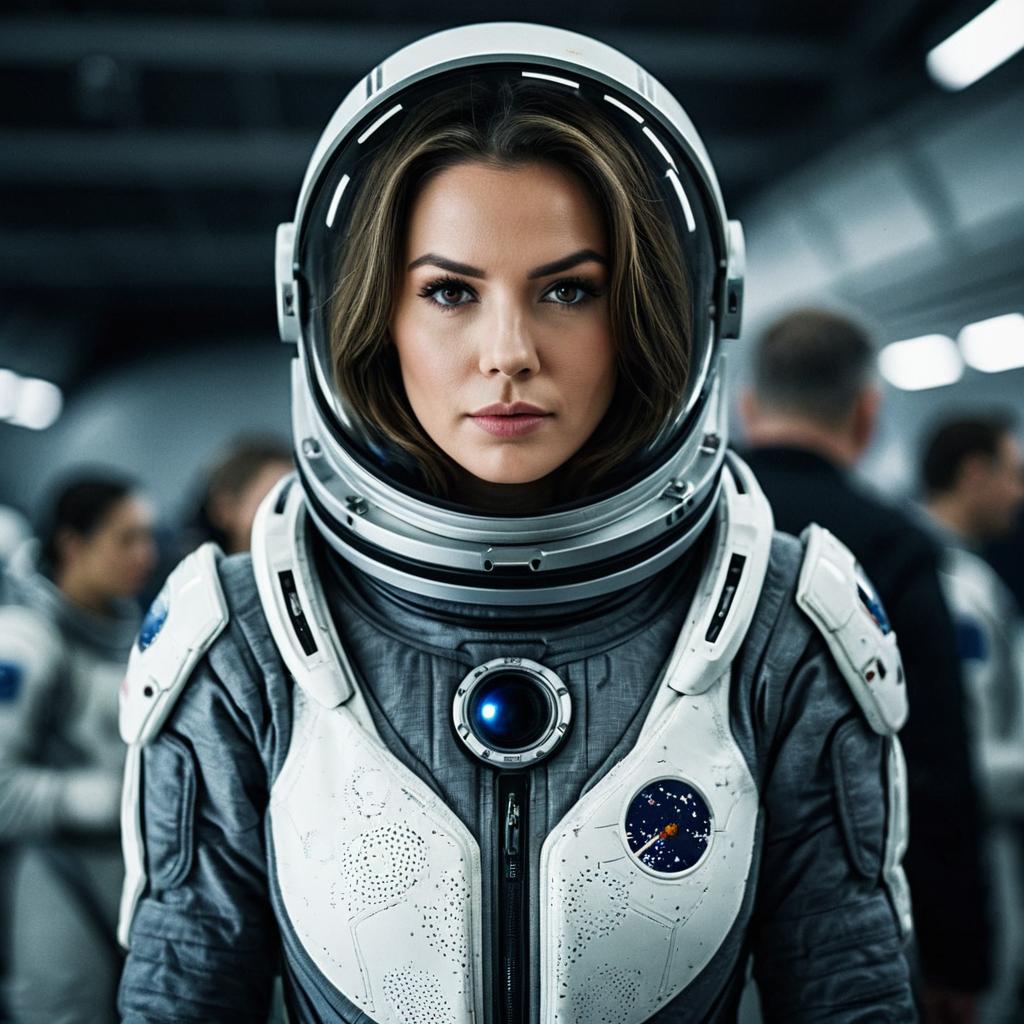 Indian astronaut costume,1girl, spacesuit, astronaut, solo, realistic, earrings, jewelry, helmet, black hair, makeup, hoop earrings, lipstick, looking at viewer, lips